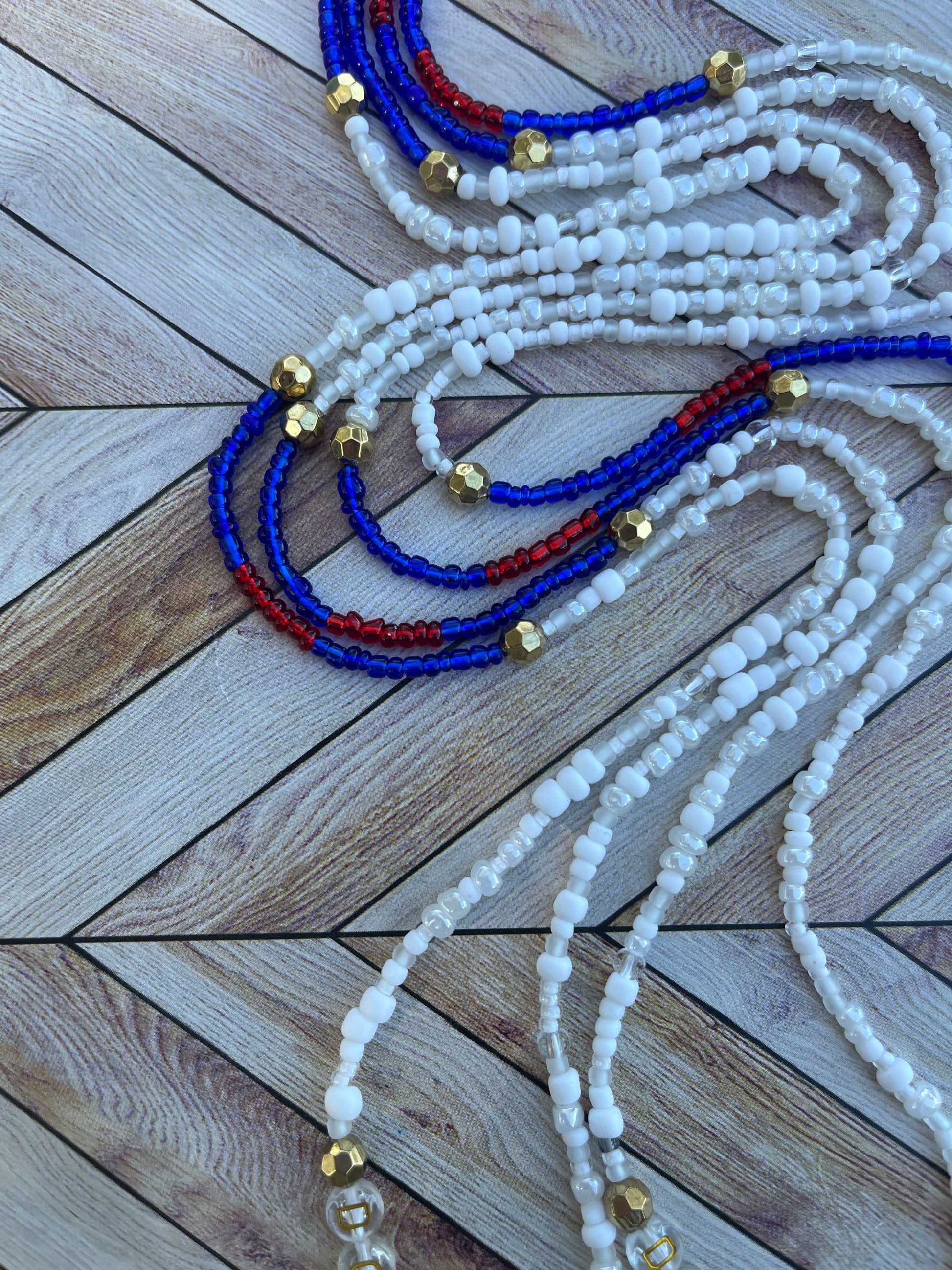 Colors: White, Blue, and Red Traditional Hand-crafted Waist beads.