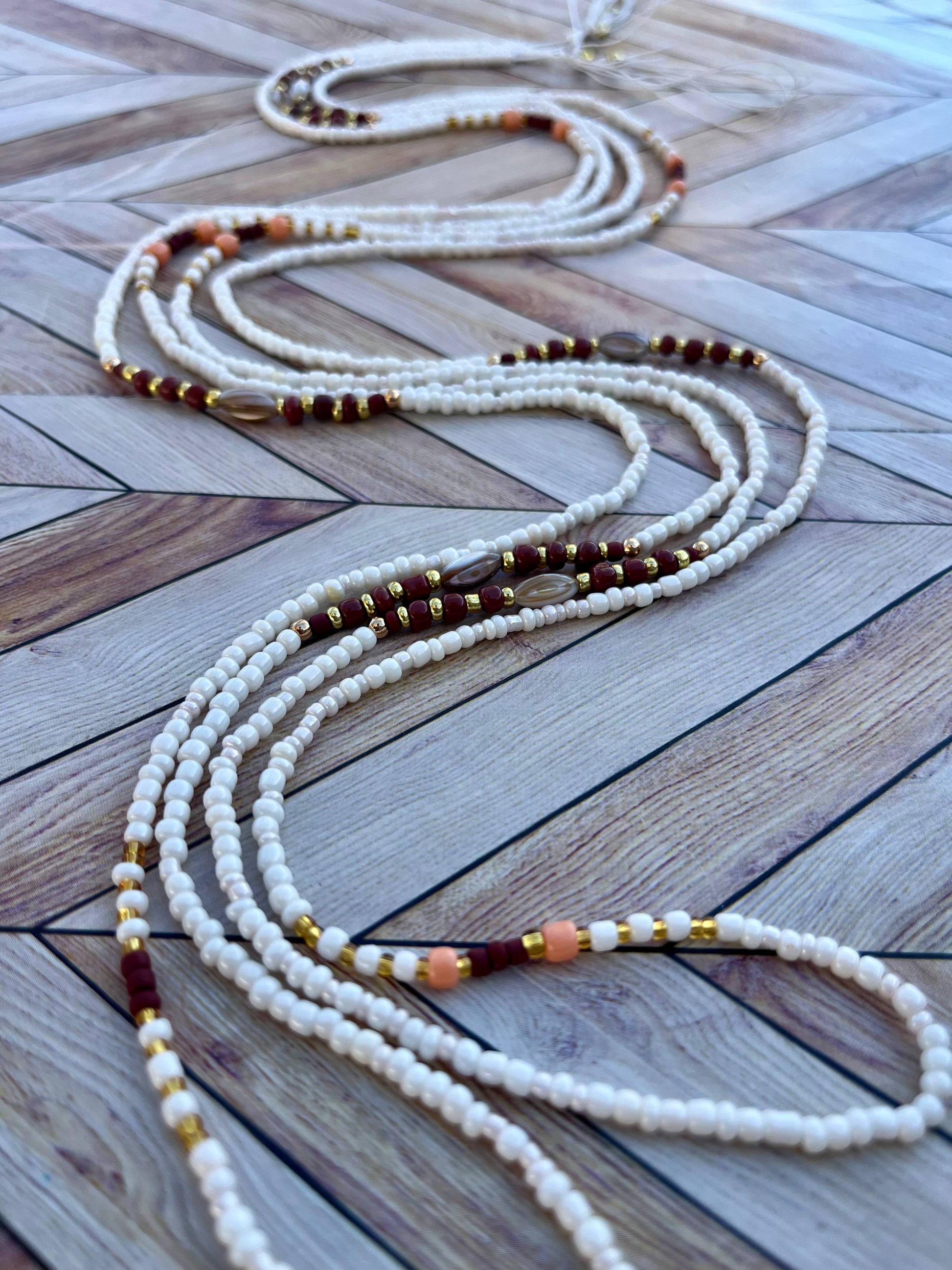 Colors: Ivory, Burgundy, and Peach Traditional Hand-crafted Waist beads.